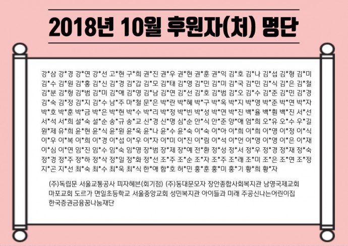 10월 후원자(처) 명단 페이지 정보 작성자 박명지 댓글 0건 조회 24,058회 작성일 18-11-14 16:57 본문 항상 함께해주시는 모든 분들께 감사드립니다^^ 목록 이전글2018년(1월-10월) 후원금(품) 수입사용내역 18.11.15 다음글2018-2회 사업설명회 질의응답 건 18.11.09 댓글목록 댓글목록 등록된 댓글이 없습니다.