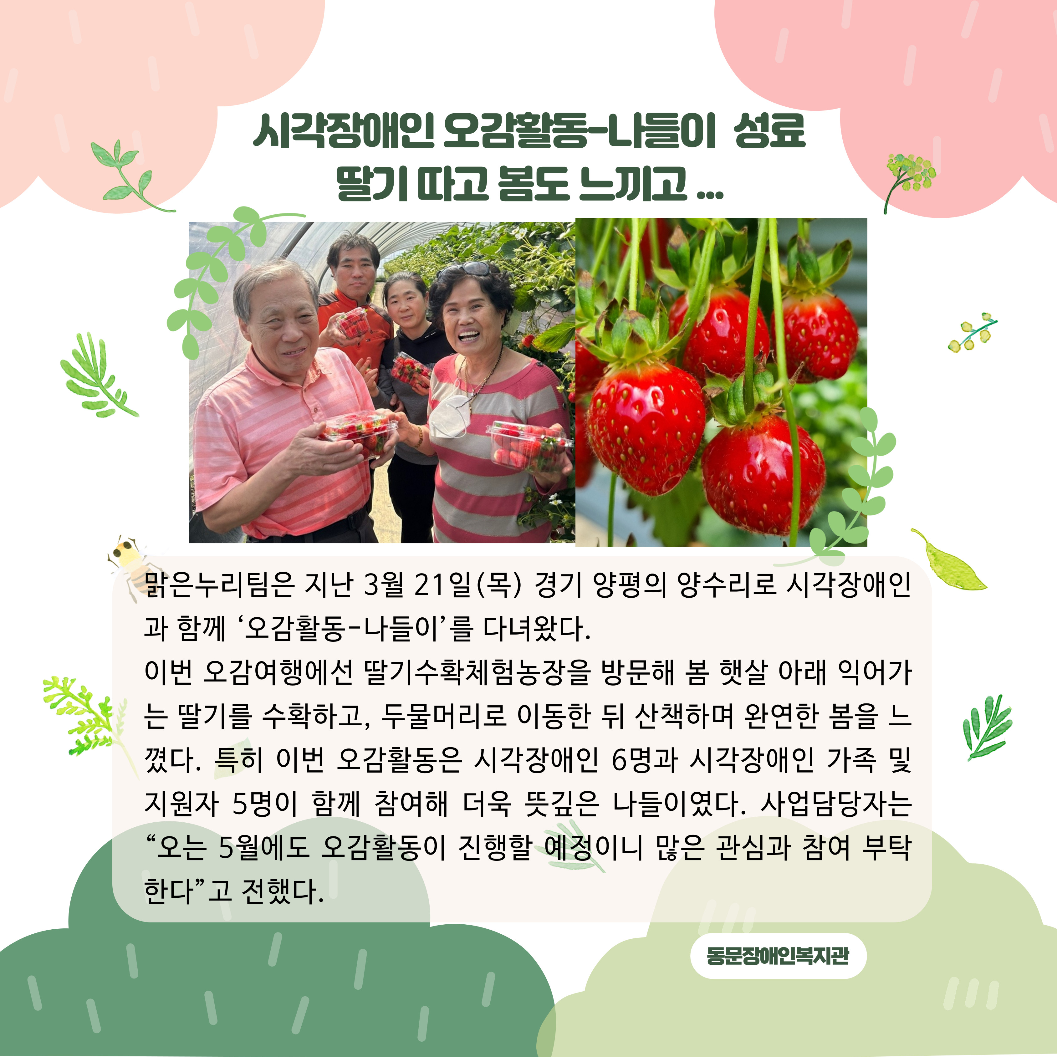 공지 동문카드뉴스(4월 소식지), 4/1(월) 발행 페이지 정보 작성자동문장복 댓글 0건 조회 5,423회 작성일 24-04-01 21:01 본문 안녕하세요? 동문장애인복지관입니다. 우리 복지관에서 일어났던 3월의 소식과 4월의 행사정보를 모아 카드뉴스(소식지)를 만들었습니다!많은 관심 부탁드립니다. 또 항상 응원해 주셔서 감사합니다. 전 직원이 최선을 다하여 이용자의 행복과 권리를 지키겠습니다. 목록 이전글[소.나.기] 복지관 후원회장, 애드리절트 이승민 대표 방문 및 2024 사업논의 24.04.03 다음글[소.나.기] 성진컴퍼니♥동문장애인복지관 업무협약(MOU) 체결! 24.04.01 댓글목록 댓글목록 등록된 댓글이 없습니다.