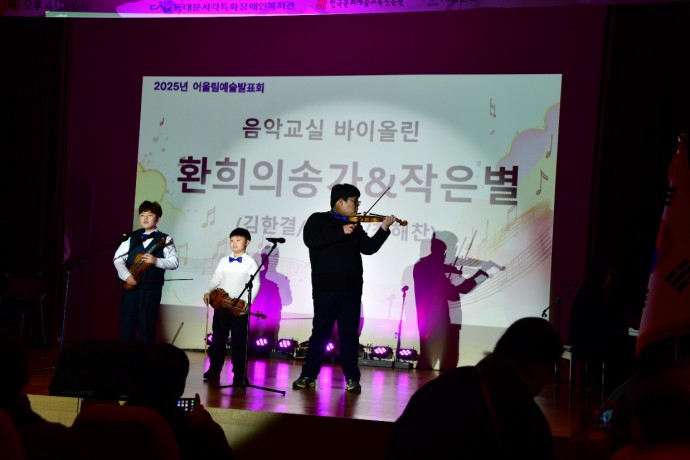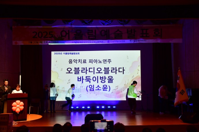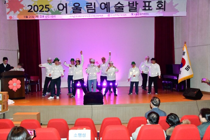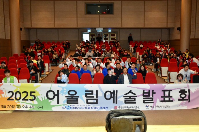 지난 11월 20일 동대문시각특화장애인복지관은 ‘2025 어울림예술발표회’를 개최하였습니다. 평소 본 복지관 예술 활동 프로그램을 이용하던 참여자들이 그동안 갈고닦은 실력을 발표회를 통해 선보였습니다. 이번 발표회에서는 무용, 음악 등 다양한 예술 활동을 통해 참여자들의 잠재력을 발굴하고 지역사회와 공유하는 데 의미를 두었습니다. 특히 무용 분야에서는 한국문화예술교육진흥원 ‘2025 문화예술교육 지원사업’인 ‘예술누림’ 사업으로 20여 차례 프로그램을 진행하였고, 이 프로그램에 참여한 직업적응훈련들이 이 기간 연습한 작품을 무대에 올려 예술적 성취와 협업의 가치를 전달하였습니다.