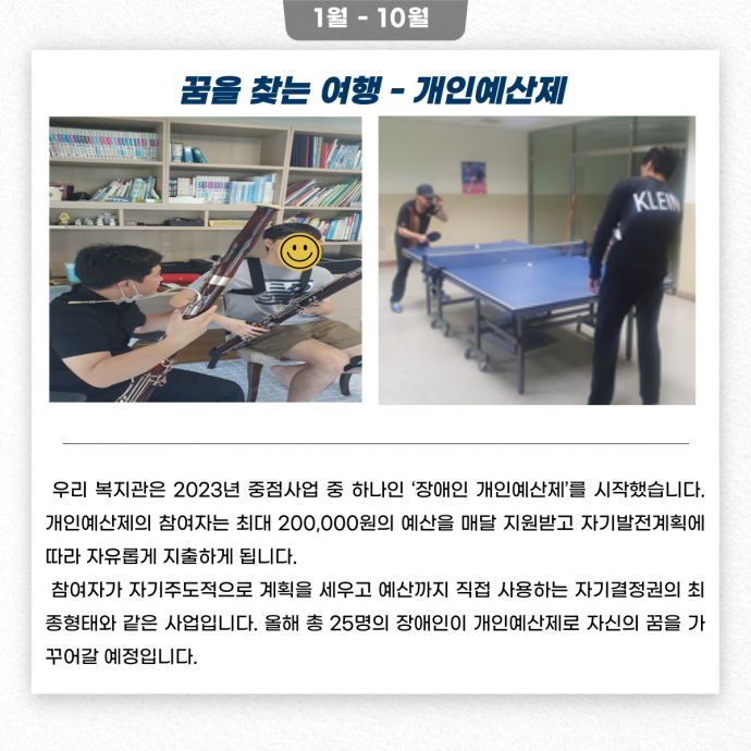 기획·나눔·봉사 동문카드뉴스(1월 소식지) 페이지 정보 작성자지역권익팀(박일규) 댓글 0건 조회 12,122회 작성일 23-02-07 15:51 본문 안녕하세요? 동문장애인복지관 입니다. 우리 복지관의 지난 1월 소식을 엮어 카드뉴스를 만들었습니다.사진 파일을 클릭하면 확대가 됩니다, 첨부 파일로도 올려져 있으니 편하신 방법으로 봐주세요.전 직원이 이용자의 행복과 권리를 위해 최선을 다하고 있습니다. 많은 관심과 응원 부탁드립니다. 감사합니다. 첨부파일 동문카드뉴스1월 소식지.pdf (15.0M) 94회 다운로드 | DATE : 2023-02-08 13:57:13 목록 이전글2월 개별지원팀 서비스일정표 23.02.08 다음글2023년 2월 프로그램 안내 23.02.06 댓글목록 댓글목록 등록된 댓글이 없습니다.