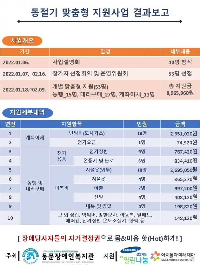 상담·사례·재가 동절기 맞춤형 지원사업 결과보고 페이지 정보 작성자개별지원팀(임미진) 댓글 0건 조회 14,969회 작성일 22-03-11 14:06 본문 1. [동절기 맞춤형 지원사업] 이란? - 삼성카드 열린나눔과 아이들과 미래재단 지원으로 진행한 이 사업은 에너지 취약계층 장애당사자들의 자기결정권을 통한 난방 및 방한용품을 지원하는 것으로 장애당사자가 주도적으로 사업을 운영하며, 본인이 필요한 물품을 스스로 선택하여 지원받는 방법으로 진행되었습니다.2. [동절기 맞춤형 지원사업] 결과보고3. [동절기 맞춤형 지원사업] 사진으로 보기 목록 이전글동문소식 - 2022년 2월 22.03.18 다음글발달이 느린 아이를 위한 학교생활 안내 22.03.07 댓글목록 댓글목록 등록된 댓글이 없습니다.