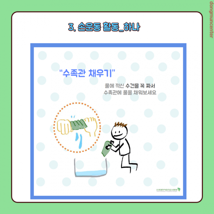 체육·기능·발달 "슬기로운 작업활동"_가족과 함께 실내에서 할 수 있는 작업활동을 소개합니다! 페이지 정보 작성자기능향상팀(장정애) 댓글 0건 조회 21,123회 작성일 20-06-04 09:46 본문 목록 이전글2020년 서울스몰스파크사업 1차 소모임 선정(5개) 20.06.09 다음글2020년 동문장애인복지관 사회복지현장실습생 모집 20.06.01 댓글목록 댓글목록 등록된 댓글이 없습니다.