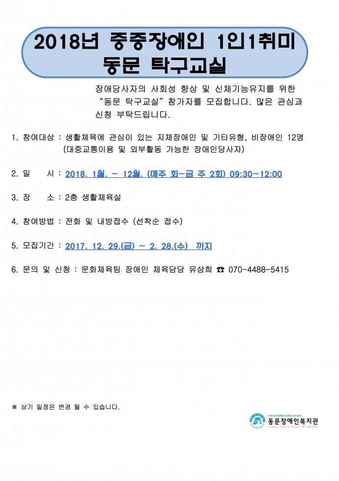 2018년도 중중장애인 1인 1취미 탁구교실 참여인원 모집 홍보 페이지 정보 작성자 기능향상팀(유상희) 댓글 0건 조회 23,719회 작성일 17-11-30 17:15 본문 목록 이전글11월 업무추진비 17.12.04 다음글2017년 추경예산 및 2018년도 세입 · 세출 예산 공고 17.11.30 댓글목록 댓글목록 등록된 댓글이 없습니다.