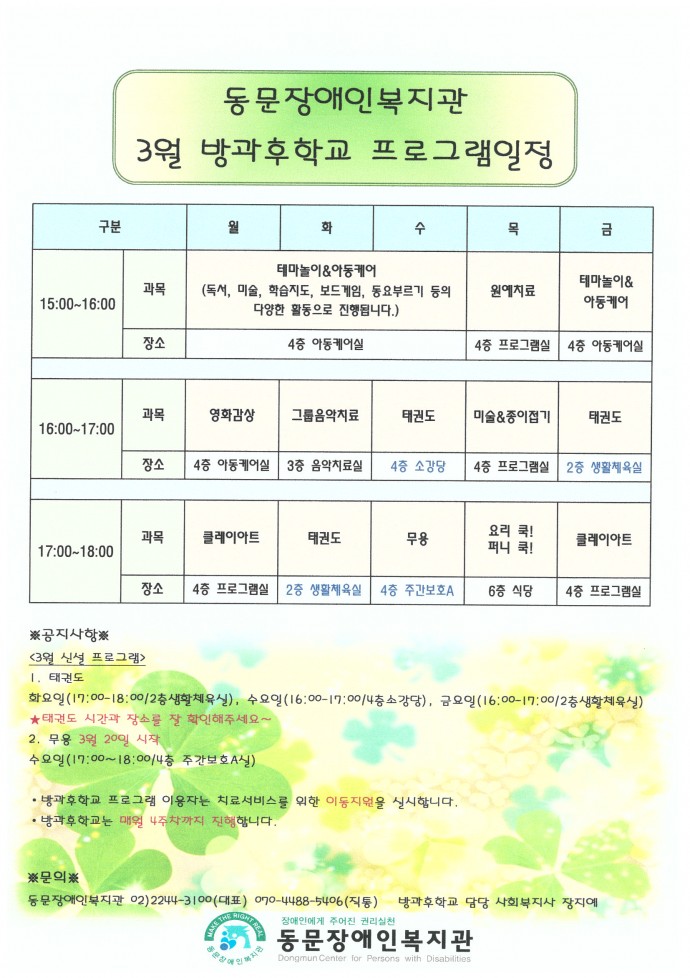 교육의료 3월 방과후학교 프로그램 일정 안내 페이지 정보 작성자장지예 댓글 0건 조회 34,325회 작성일 13-03-13 11:16 본문 3월 방과후학교 프로그램이 시작되었습니다. 상시 모집하고 있으니 많은 관심과 신청 부탁드립니다. 자세한 사항은 장지예 담당사회복지사(직통: 070-4488-5406)에게 문의바랍니다. 목록 이전글4월 방과후학교 프로그램 일정 안내 13.04.04 다음글2013년 생활체육대회 참가 신청 및 안내입니다 13.10.28 댓글목록 댓글목록 등록된 댓글이 없습니다.