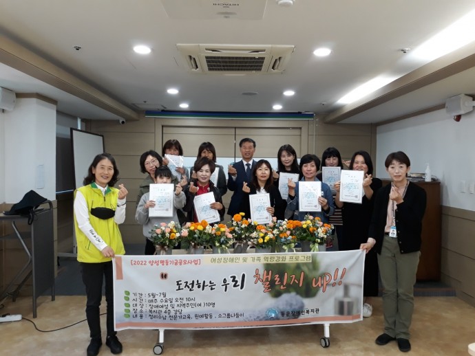 "도전하는 우리 챌린지 업" 프로그램은 양성평등기금 사업의 일환으로 사회참여가 어려운 여성장애인과 가족의 역량개발 및 사회활동 참여를 지원하는 사업입니다. 5월~10월까지 총 15회기로 진행되었고 정리수납교육을 통해 전문자격증을 취득하였고 여가활동 및 힐링을 위한 원예활동, 소그룹 나들이를 지원하였습니다. 다양한 주제로 활동하며 사회활동 참여 및 개인의 역량을 개발하는 기회가 되었습니다. 함께 참여한 모든 문들과 프로그램을 지원해 주신 강사님들께 감사드립니다.
