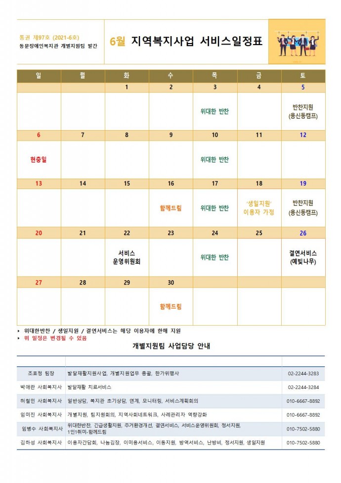 우리 이용자분들의 건강한 일상을 기원하며, 개별지원팀 6월 서비스 일정표를 안내하오니