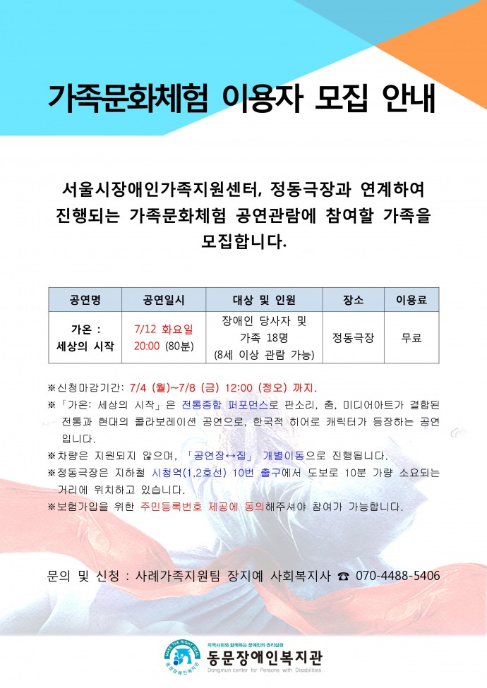 사례가족지원 가족문화체험 "가온:세상의 시작" 공연관람 홍보 및 이용자 모집 안내 페이지 정보 작성자장지예 댓글 0건 조회 22,426회 작성일 16-07-04 11:15 본문 목록 이전글직업적응훈련반 1박2일 여름캠프 16.07.04 다음글지역복지팀 2016.7. 프로그램안내2 16.06.27 댓글목록 댓글목록 등록된 댓글이 없습니다.