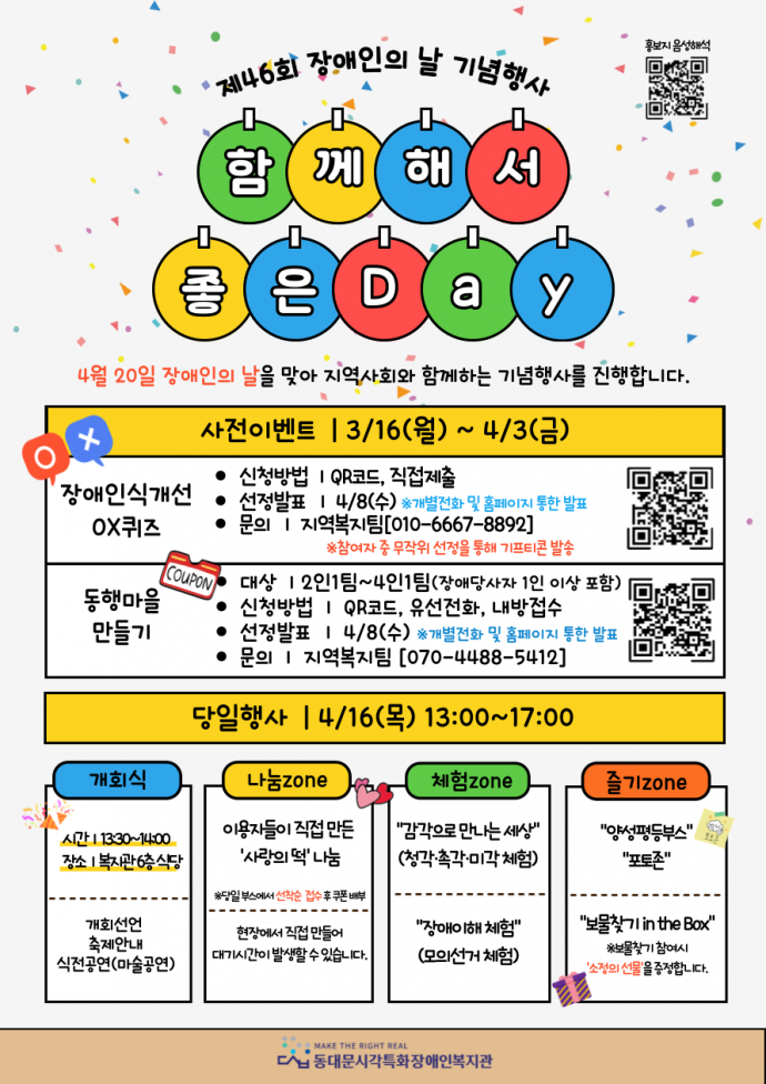 동대문시각특화장애인복지관에서는 제46회 장애인의날을 기념하여 지역주민과 함께하는 기념행사를 진행합니다.