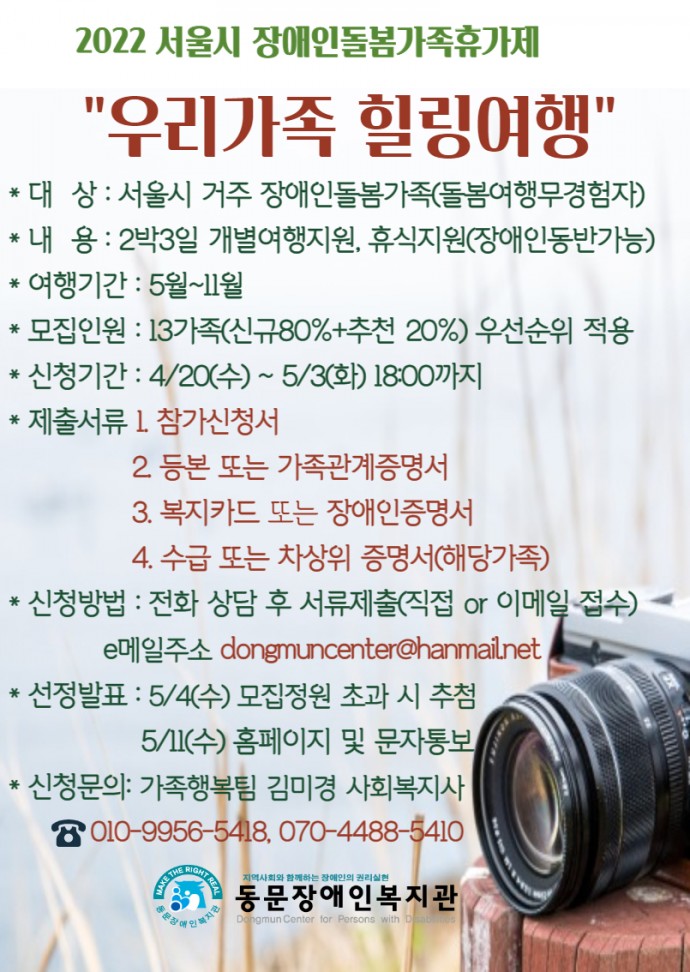* 내 용: 2박3일 개별가족여행 (장애인동반),(여행경비1인 39만원(1일)+돌봄비 21만원(3일),참여 인원수에 따라 여행경비는 조정됨